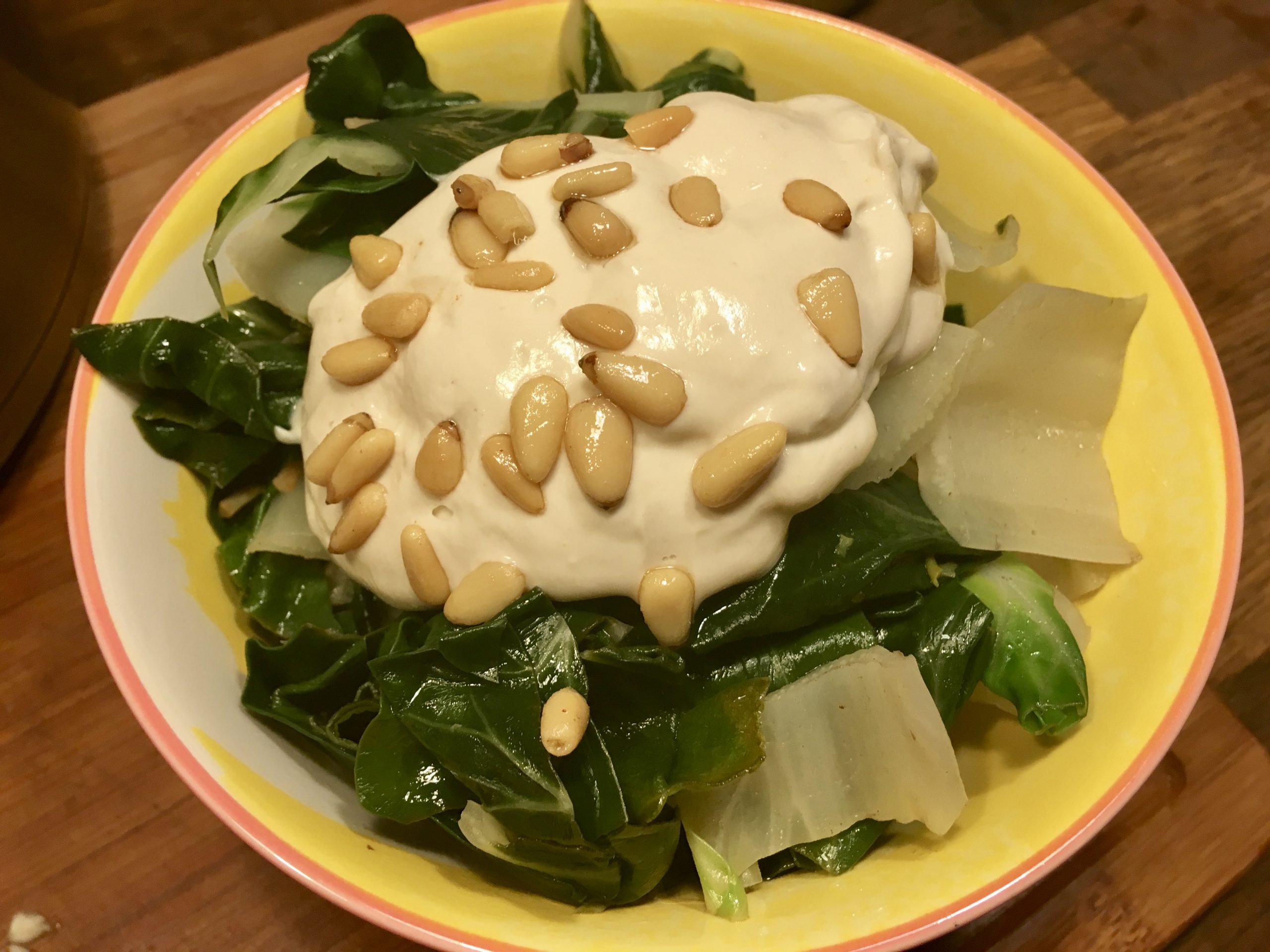 Serviert wird der Mangold dann mit der Tahini-Sauce und den gerösteten Pinienkernen.