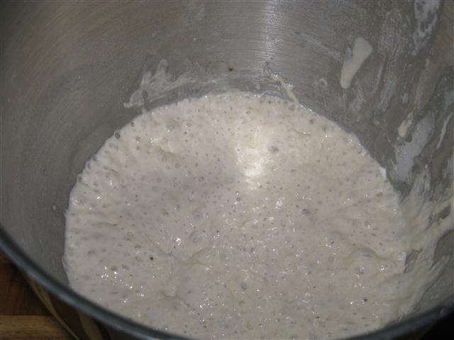 Schon am Vorabend hatte ich für das Brot den Vorteig zusammengerührt aus 300g Weizenmehl 550, 280ml Wasser und 3g Hefe. Brote mit langer Teigführung schmecken intensiver als schnell aufgegangene mit hohem Hefeanteil. Genau so ein Brot wollte ich machen. Der Vorteig wanderte für 12 Stunden in den Kühlschrank und wurde gestern vormittag entnommen und in der warmen Küche noch mal 6 Stunden aufbewahrt, so dass der Teig schön fermentieren konnte. Als wir vom Ramster-Ausflug zurückkamen, war der Teig voller Blubberbläschen und duftete wunderbar.