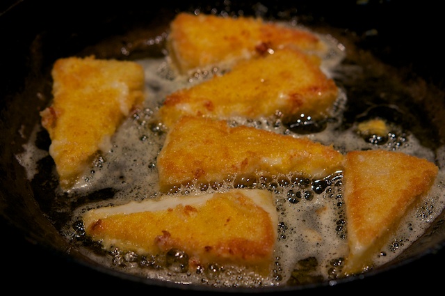 In heißem Olivenöl brate ich nun die Käsestücke von beiden Seiten, bis die Kruste goldbraun ist und der Kern sich verflüssigt hat.