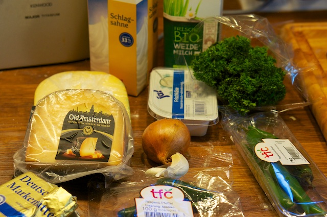 - 300g geriebener Käse, halb Gouda und halb Old Amsterdam