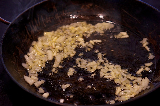 Die Zubereitung kommt Euch sicher vertraut vor, da gehe ich ja immer ähnlich vor. Zwiebeln und Knoblauch hacken und in Olivenöl anbraten, das ist der erste Schritt.