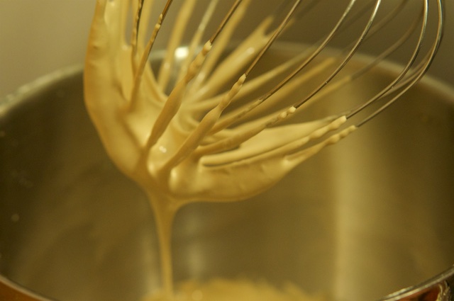 Die Eier trenne ich auf und gebe die Eigelb mit dem Wasser und dem dunklen Zucker in die Küchenmaschine. Mit dem Schneebesen schlage ich die Eier so lange auf, bis eine dickschaumige Masse entstanden ist und der Zucker sich komplett aufgelöst hat. Durch den stark gefärbten Zucker sieht die Eiermasse wie eine Karamell- oder Mokkasauce aus.