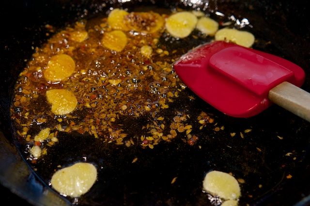 Die Knoblauchknolle schneide ich in dünne Scheiben und brate sie in dem Olivenöl ein paar Minuten an, nach ungefähr der Hälfte der Zeit gebe ich die 4 Gewürze dazu – Kreuzkümmel und Koriandersamen hatte ich zuvor im Mörser grob zerstoßen.